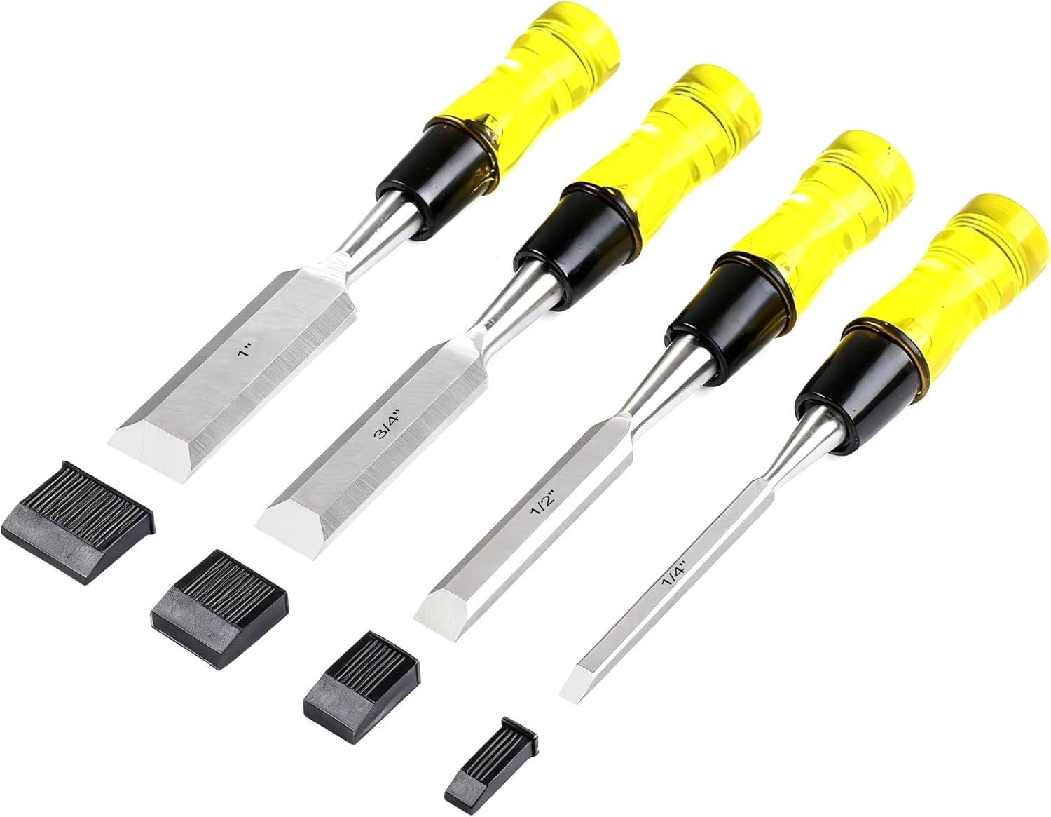 4 Piece Wood Chisel Set for Woodworking. CR-V Steel Beveled Edge Blades with Safety Caps. Durable PVC High Impact Handle, for Precision Carving & DIY Projects (1/4", 1/2", 3/4", 1")